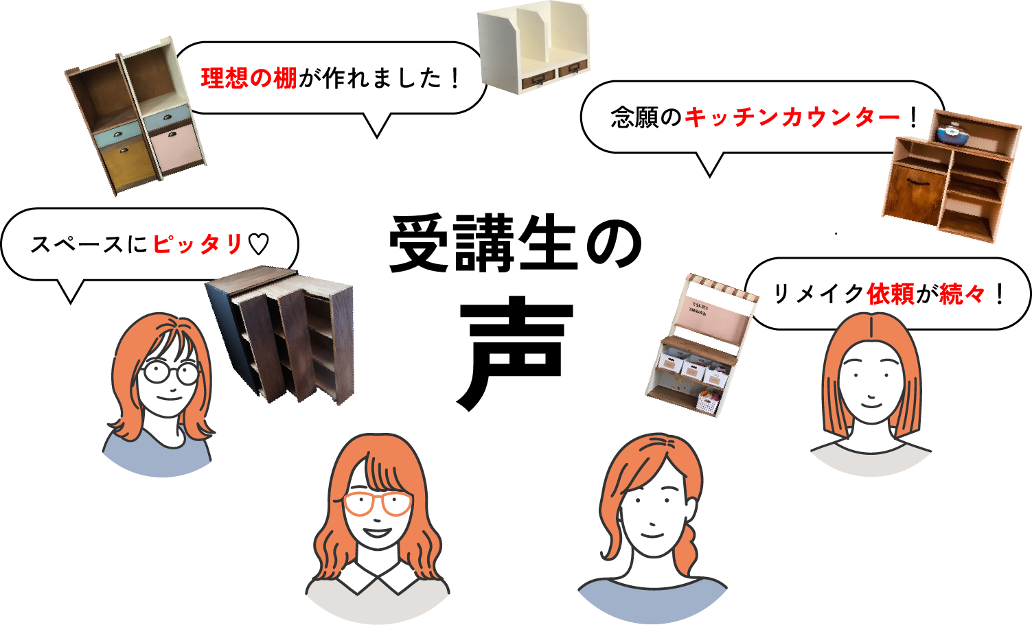 「卒業検定試験を経て、晴れてDIYプランナーに!「あったらいいな」が「作っちゃおう!」に代わります。 制作についていつでも相談できるから卒業後も作り続けられる安心感があります!